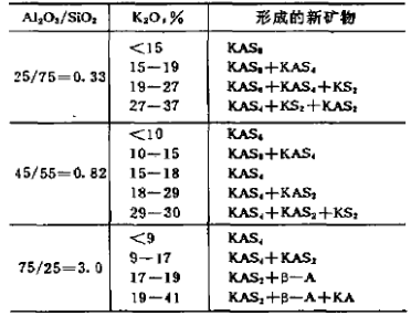 Al2O3/SiO2=0.82相當(dāng)于Al2O3含量45%的粘土磚,K2O含量>15%時(shí),開始有白榴石形成,磚會(huì)發(fā)生“堿裂”。