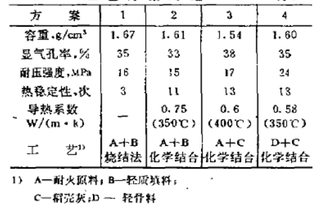 傳統(tǒng)的制造隔熱磚的方法是在原料中添加可燃物或輕質(zhì)填料,機(jī)壓成型并經(jīng)高溫煅燒而成,或直接用輕質(zhì)原料制作。其制品強(qiáng)度低,耐磨性差,不能直接作耐火襯里。本試驗(yàn)選擇了幾種新工藝。其制品性能見表3。