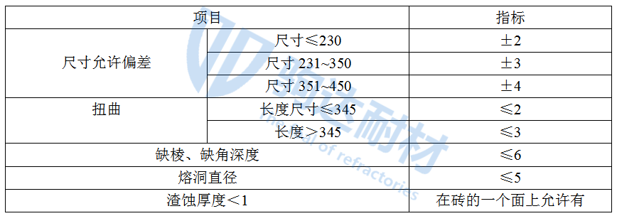 表2 熱風爐用黏土磚的尺寸允許偏差及外觀