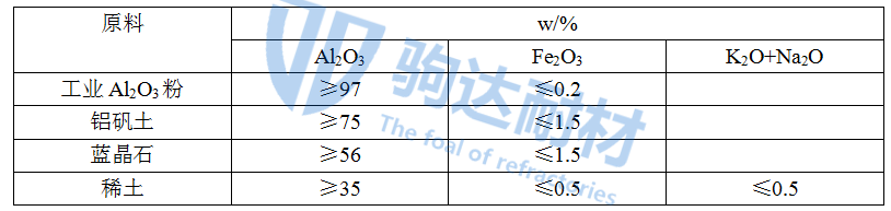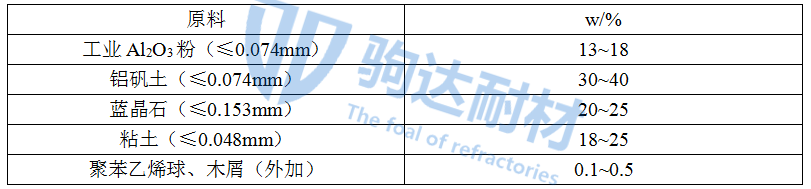 以工業(yè)Al2O3粉、粘土、燒結(jié)良好的鋁礬土和部分藍(lán)晶石為主要原料,添加木屑(1mm篩選)和聚苯乙烯球(直徑2~0.5mm)制備輕質(zhì)磚。原來化學(xué)組成見表1。