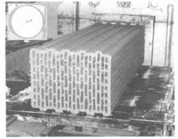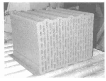圖5為經(jīng)另一機(jī)口擠出的16排孔的短壁多孔磚,其磚坯的真實(shí)密度為0.82 kg/ dm3,孔洞率為50%時的體積密度為0.41 kg/ dm3,其導(dǎo)熱系數(shù)為人=0.094W/(m.K),