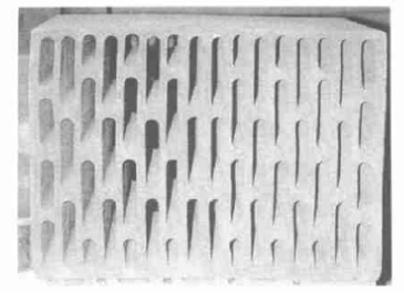 抗壓強(qiáng)度為4. 4N/mm2。該多孔磚的缺點(diǎn)是;其在工業(yè)化的生產(chǎn)中不可避免地會出現(xiàn)扭曲變形,因此,擠出型的微孔多孔磚必須具有足夠厚度的外壁和齒狀的凸起,便于磚相互間組裝拼接(見圖6),從而消除砂漿連接引起的熱力學(xué)問題。在隨后的試驗(yàn)中還擠出成型了19排孔和13排孔的10DF微孔多孔磚見圖6圖7 ,這些磚外壁還有齒狀的凸起。